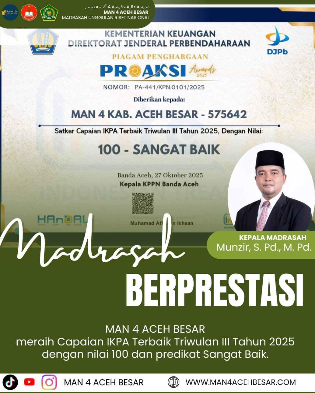 Capaian ini menjadi bukti nyata komitmen MAN 4 Aceh Besar dalam menerapkan tata kelola keuangan yang profesional, transparan, dan akuntabel. Selain itu, prestasi ini juga menunjukkan dedikasi seluruh tim dalam mewujudkan efisiensi dan efektivitas penggunaan anggaran di lingkungan madrasah.