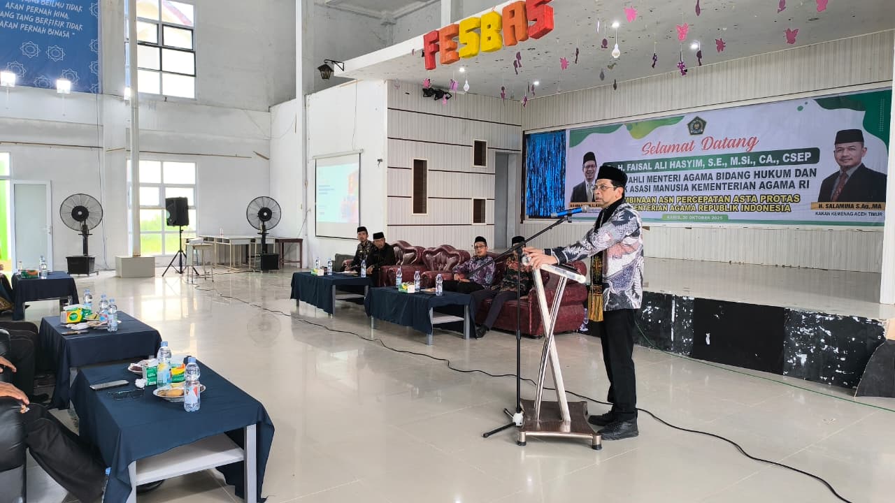Kabarnanggroe.com, Aceh Timur — Staf Ahli Menteri Agama Bidang Hukum dan Hak Asasi Manusia Kementerian Agama Republik Indonesia, Dr. H. Faisal Ali Hasyim, SE, M.Si, CA, CSEP, melaksanakan pembinaan bagi Aparatur Sipil Negara (ASN) di lingkungan Kantor Kementerian Agama Kabupaten Aceh Timur. Kegiatan tersebut berlangsung di Aula MAN Insan Cendekia Aceh Timur, Kamis 30 Oktober 2025.